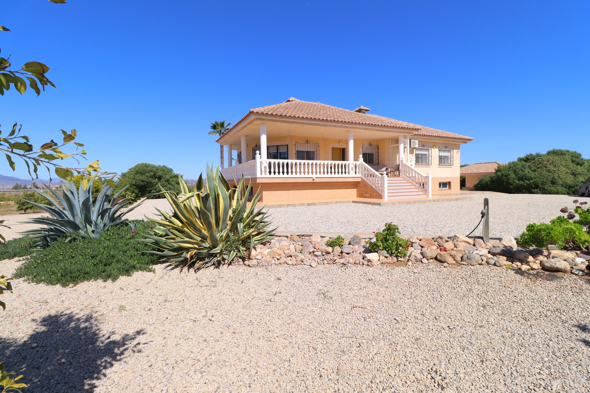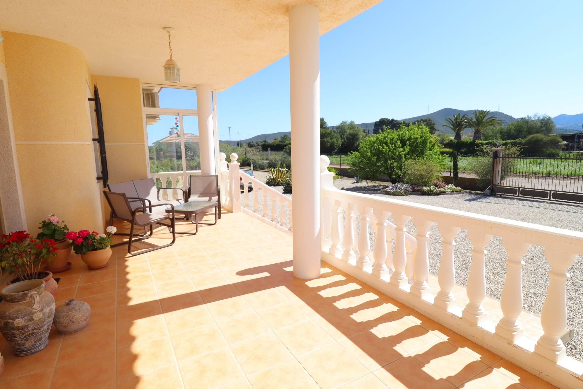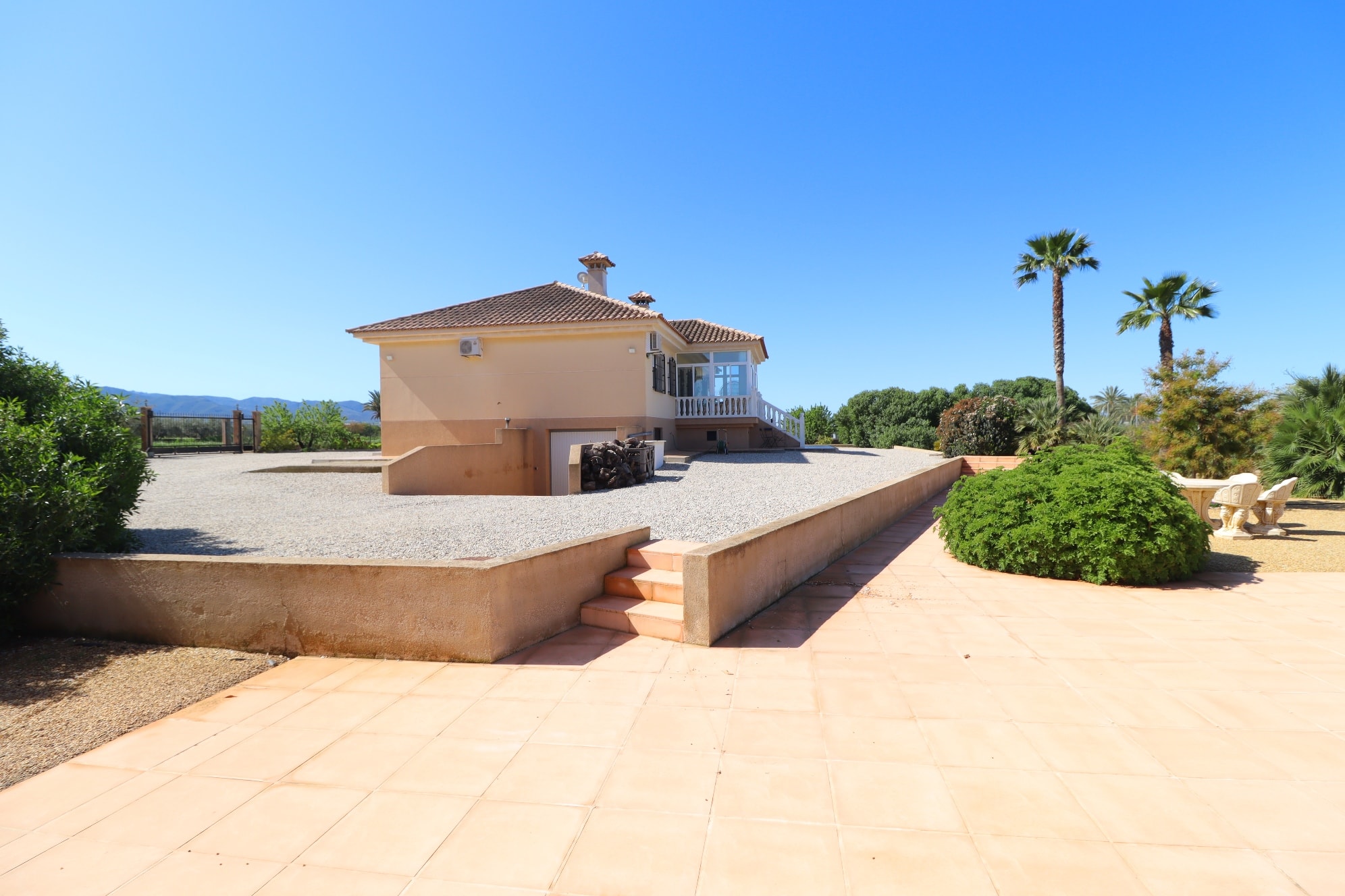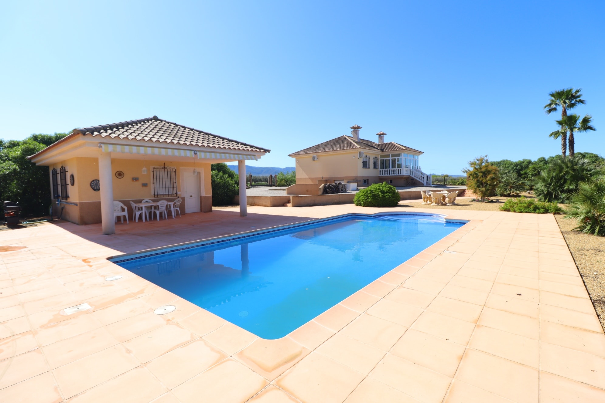 Impressive and luxury 3/4 bed 2 bath larger than average detached Villa with a massive basement/underbuild with separate garage, 11m x 5m pool, separate summer kitchen (40 m2) with full bathroom which could be used as an independent studio/apartment, oil-fired central heating, air-con in most rooms, landscaped gardens, on a fully fenced and gated plot of 5270 sq. metres of land, within walking distance to a village, 10 minutes drive to the city of Lorca with its outdoor shopping centre, and 25 minutes drive to the coastal resort of Aguilas. Stunning views across the countryside to the surrounding mountains and to the Lorca city with its illuminated medieval castle at the very top.