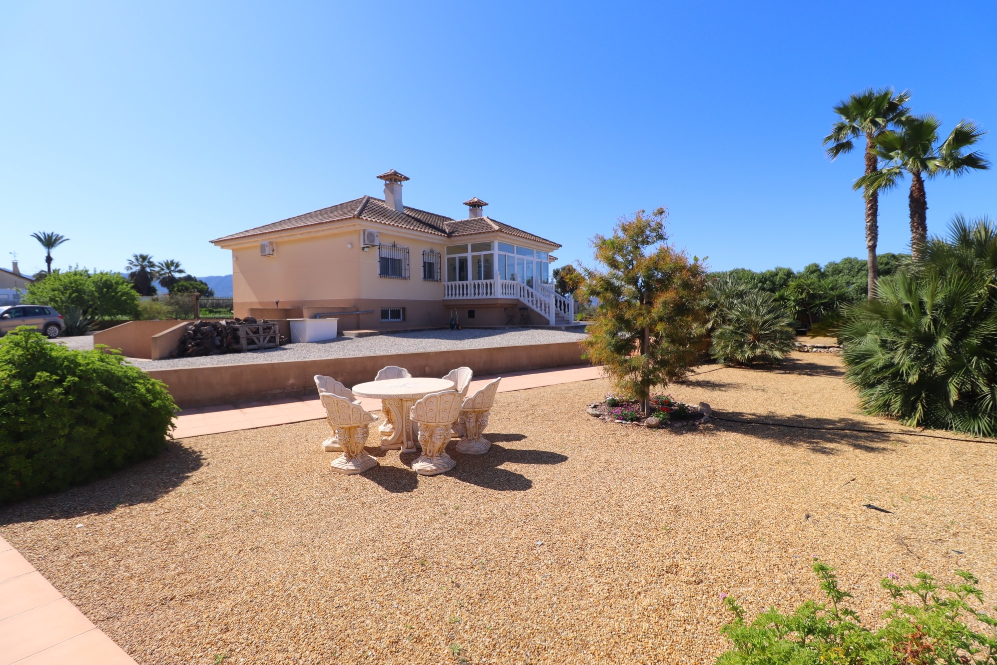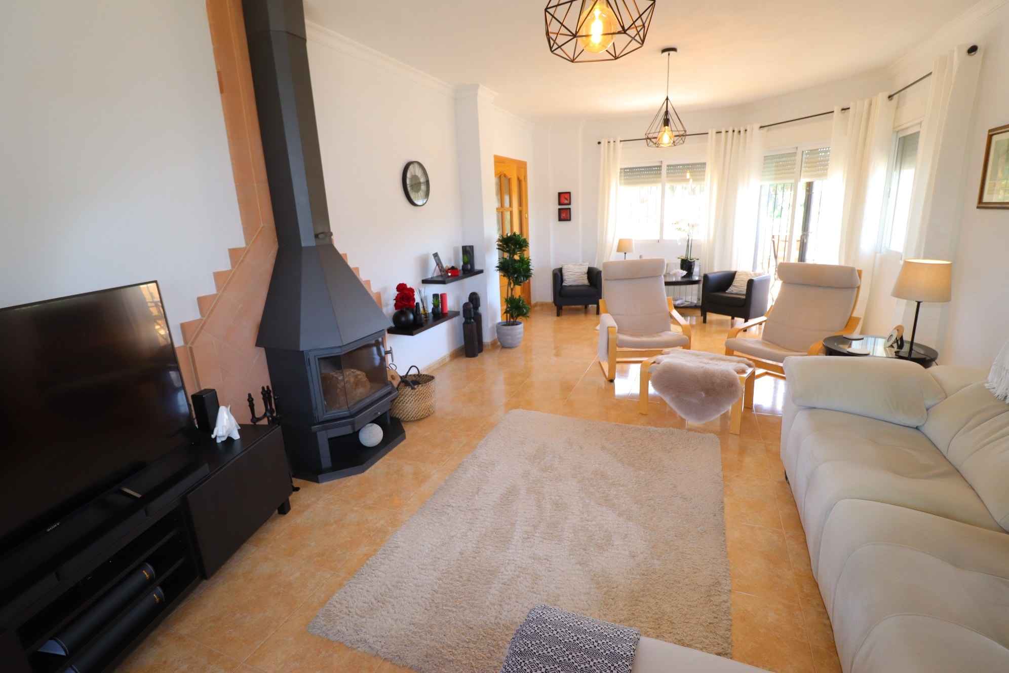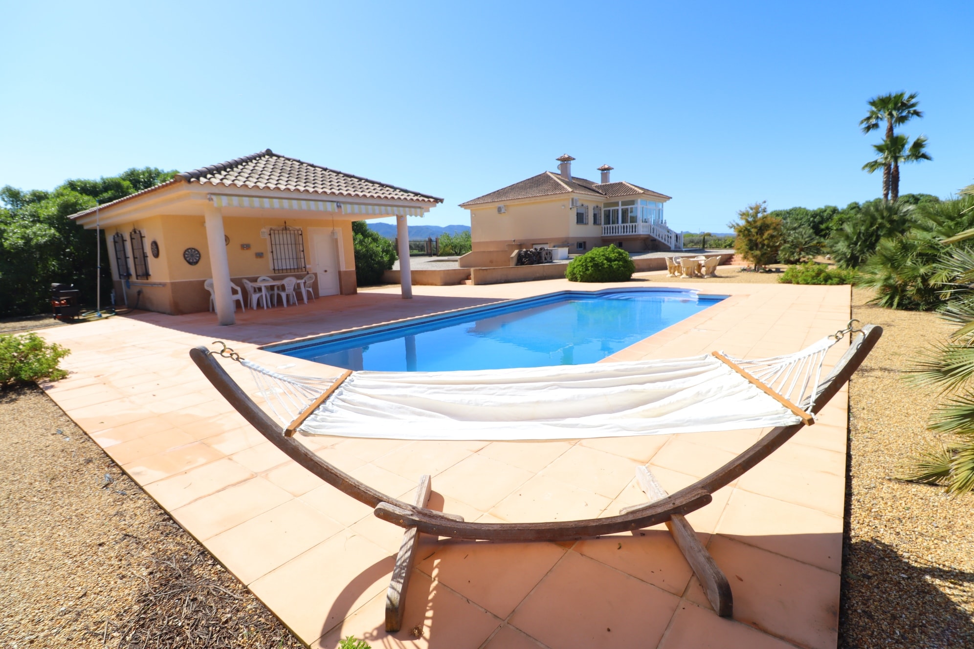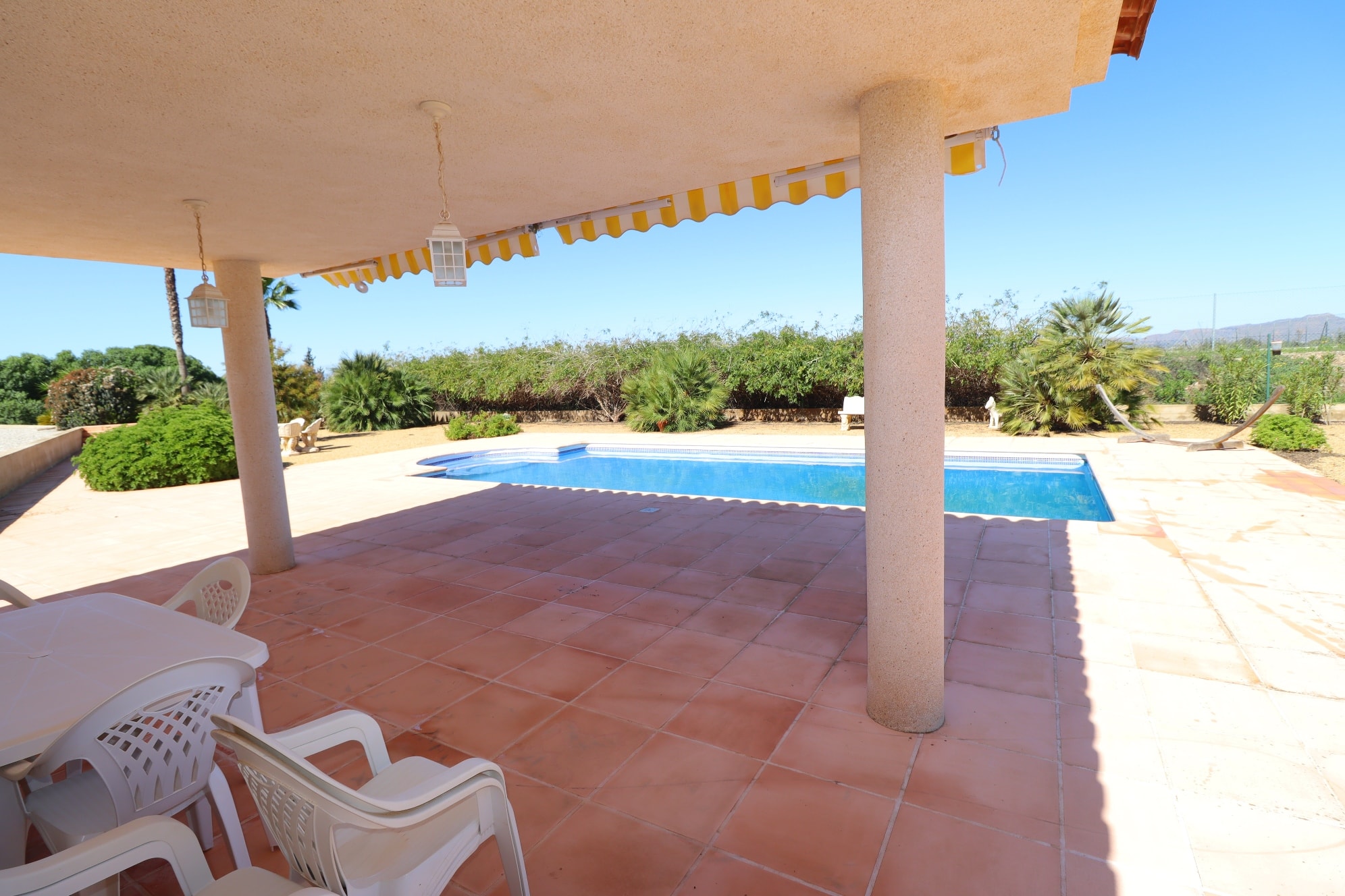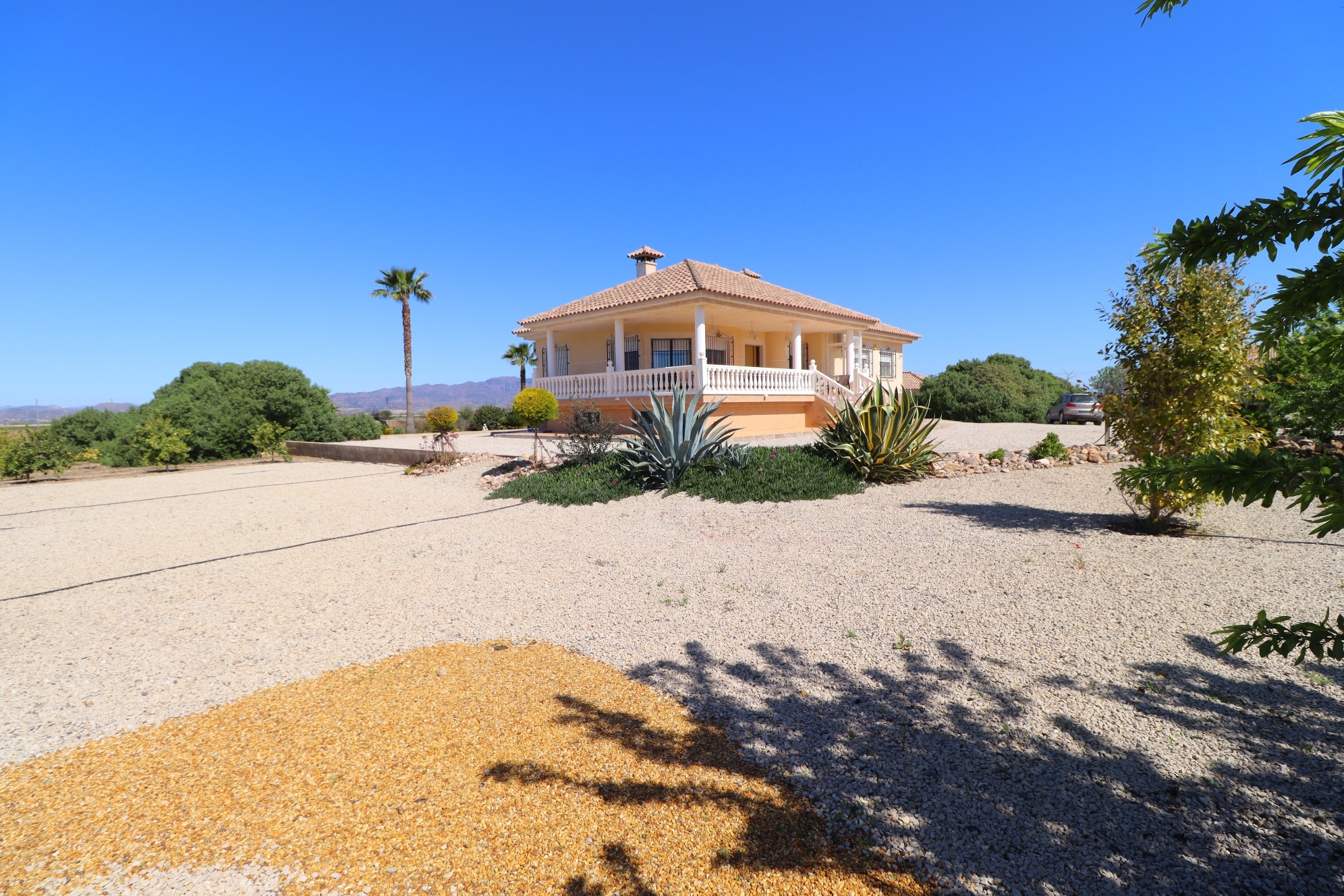 Impressive and luxury 3/4 bed 2 bath larger than average detached Villa with a massive basement/underbuild with separate garage, 11m x 5m pool, separate summer kitchen (40 m2) with full bathroom which could be used as an independent studio/apartment, oil-fired central heating, air-con in most rooms, landscaped gardens, on a fully fenced and gated plot of 5270 sq. metres of land, within walking distance to a village, 10 minutes drive to the city of Lorca with its outdoor shopping centre, and 25 minutes drive to the coastal resort of Aguilas. Stunning views across the countryside to the surrounding mountains and to the Lorca city with its illuminated medieval castle at the very top.