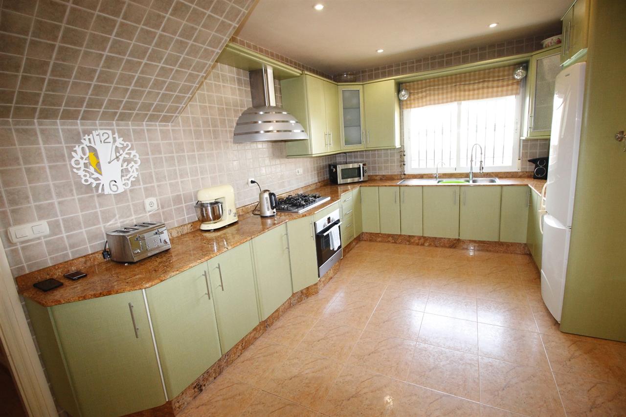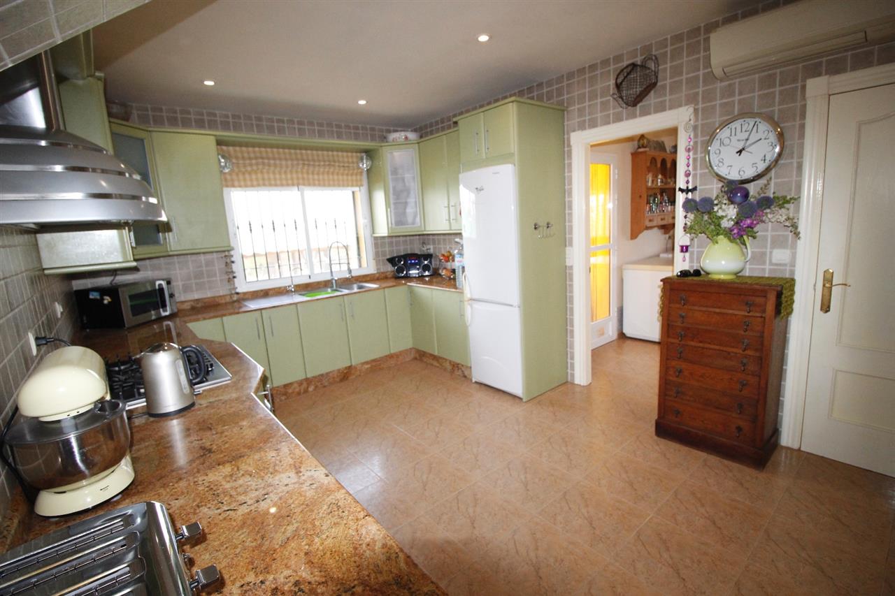Large covered front terrace with main door opening onto a wide entrance hallway. Leading off the hallway to the right are double doors leading to the spacious and bright lounge-living-diner room with corner quality wood burning stove and air conditioning unit. A door from the living room opens in to spacious fully equipped kitchen with wall and base units, granite worktops and appliances (gas hob, electric oven, fridge-freezer, etc). Also an air-conditioning unit. Adjacent larder and also good size utility room. From the utility room there is a door out to the rear of the property.