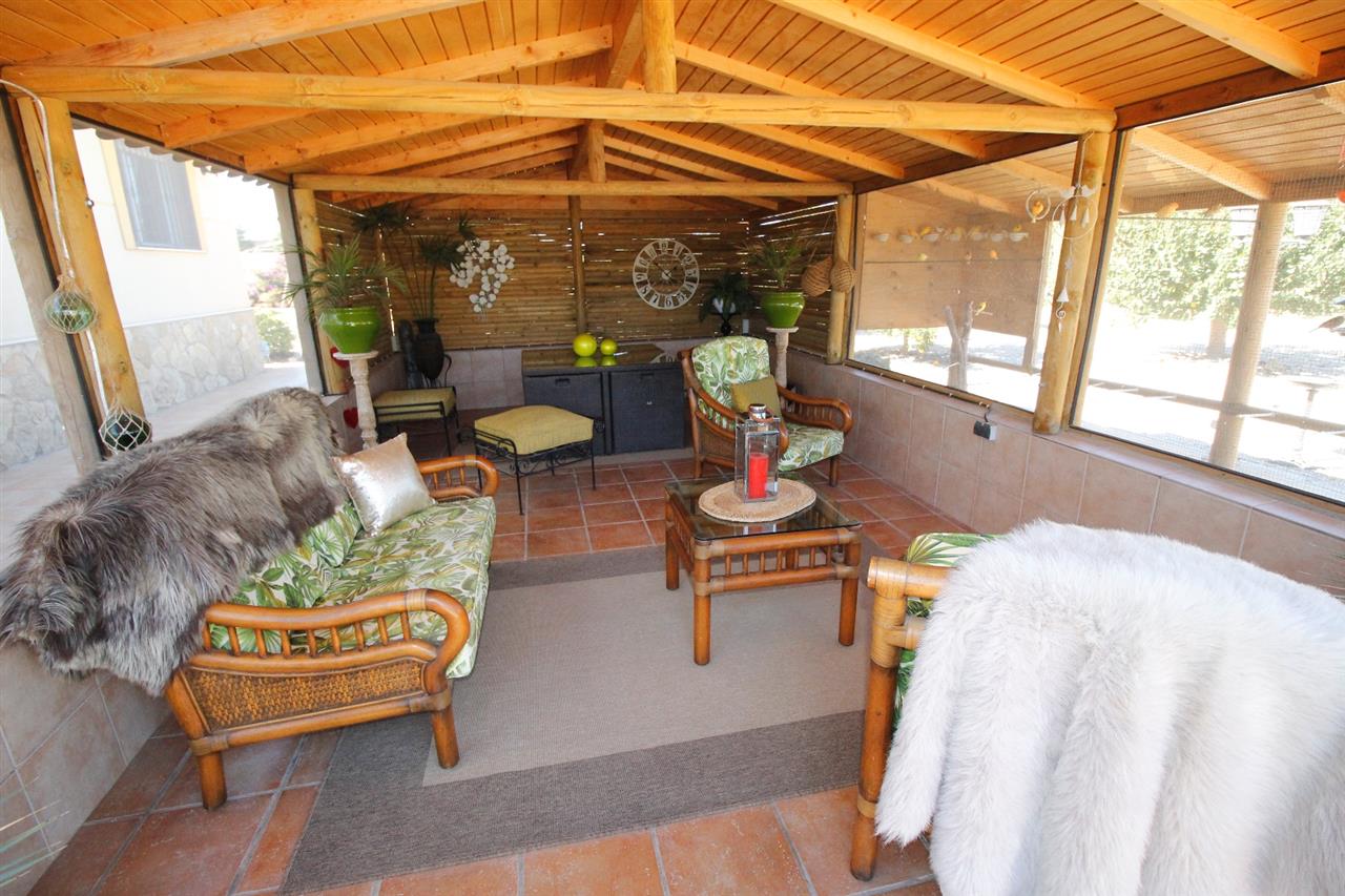 Behind the house, on an extended tiled terraced, is a large oblong wooden fly-free summer house converted into a fantastic living and dining area. Next to this is built-in aviary.