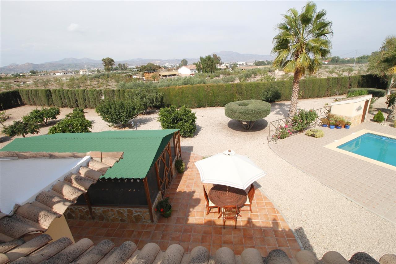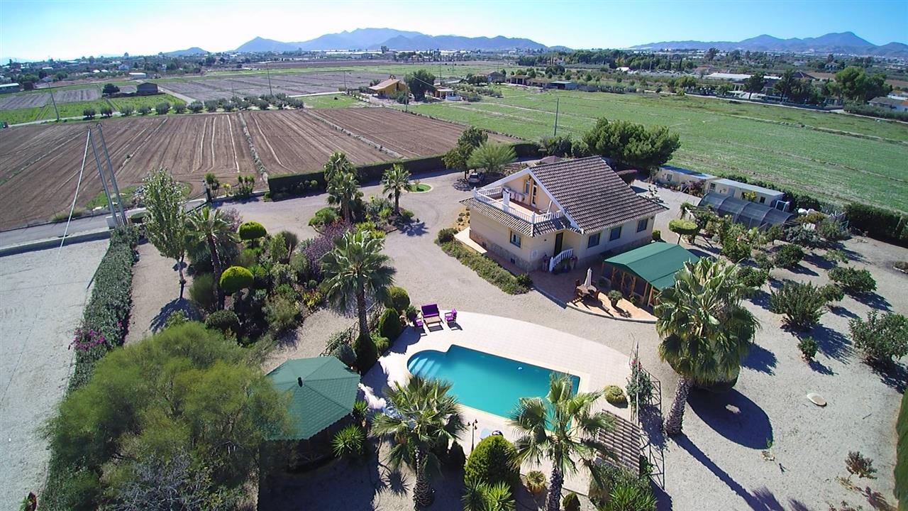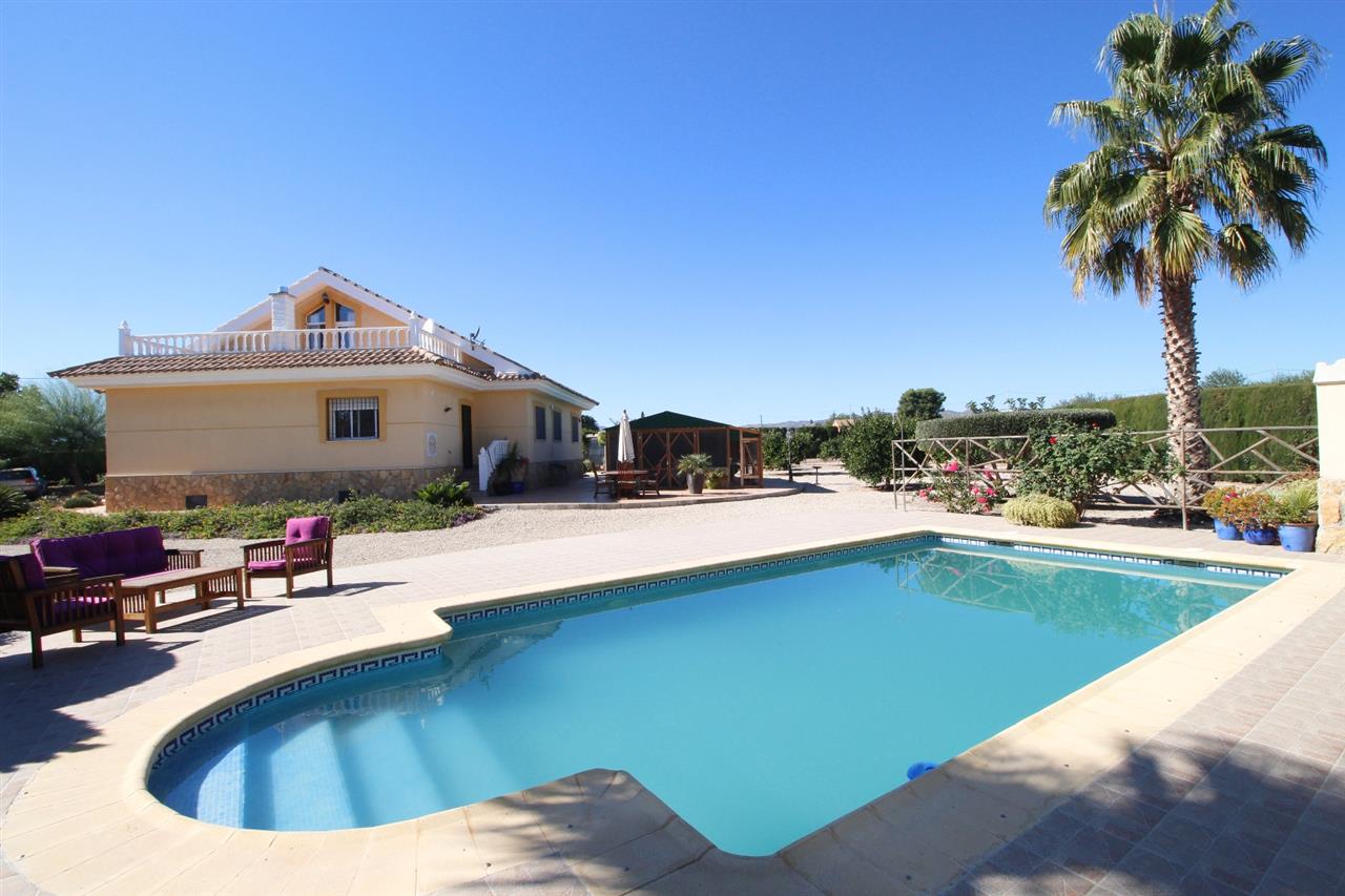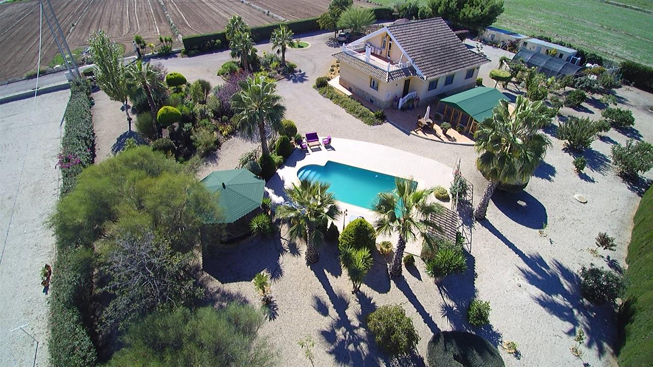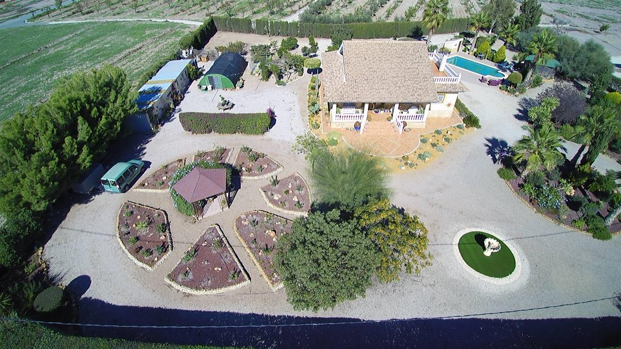 Impressive 3 bed 2 bath large detached villa plus spacious detached garage/workshop, store room, 10m x 5m pool, 2 fly free summer house, hexagonal gazebo, bird aviary, large potting shed, fenced dog kennel, immaculate landscaped gardens; on a fully fenced and gated plot of 5005 m2 giving it full privacy, situated only 2 minute drive (real 10 minutes walk) from the market village of La Estacion (Puerto Lumbreras) with plenty of amenities, 10 minutes drive from the historical city of Lorca and its outdoor shopping centre, and 30 minutes drive from the coastal resort of Aguilas.