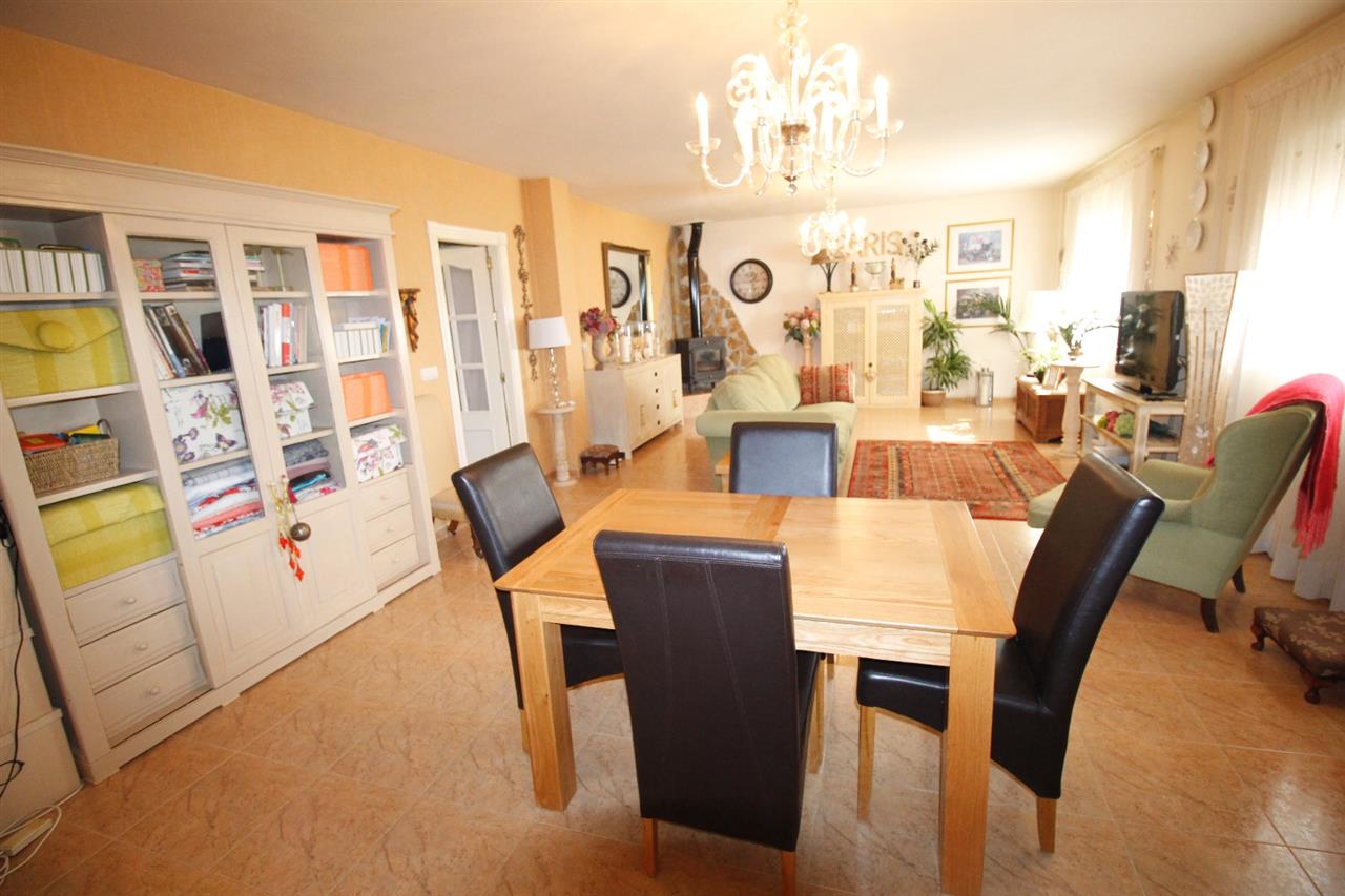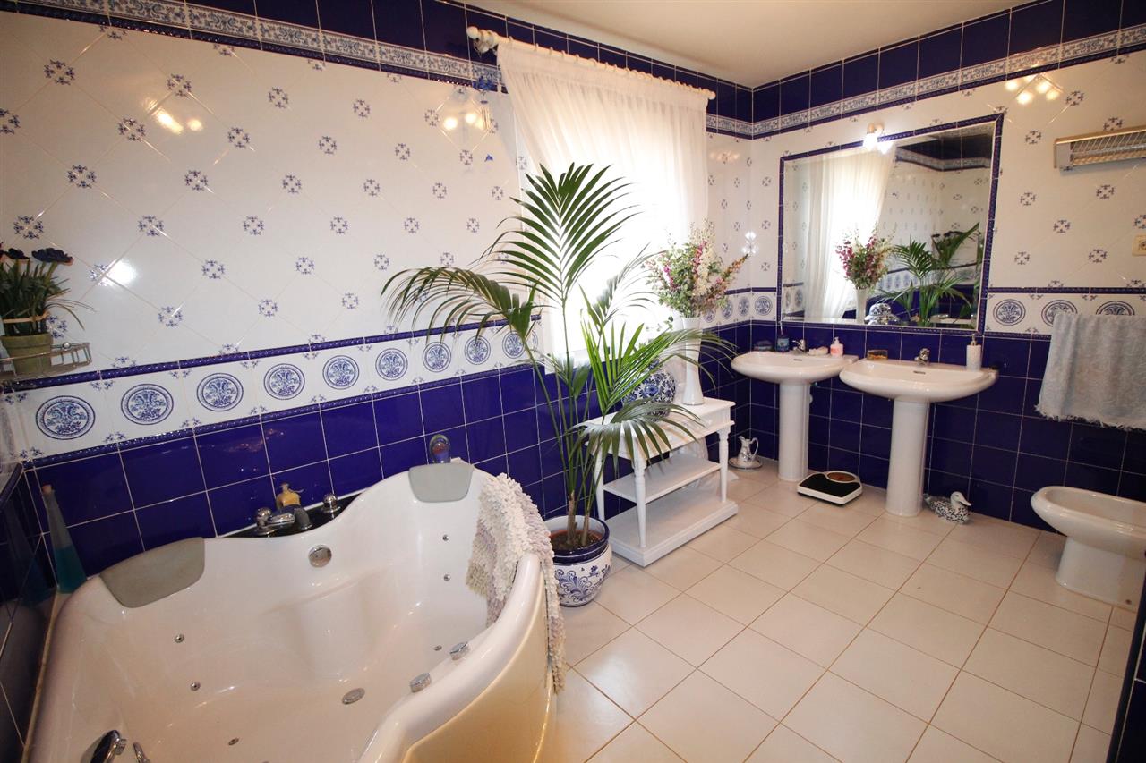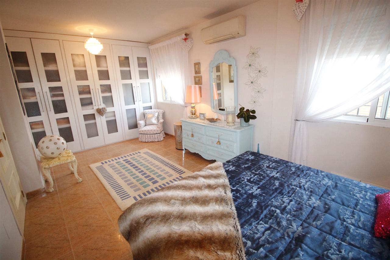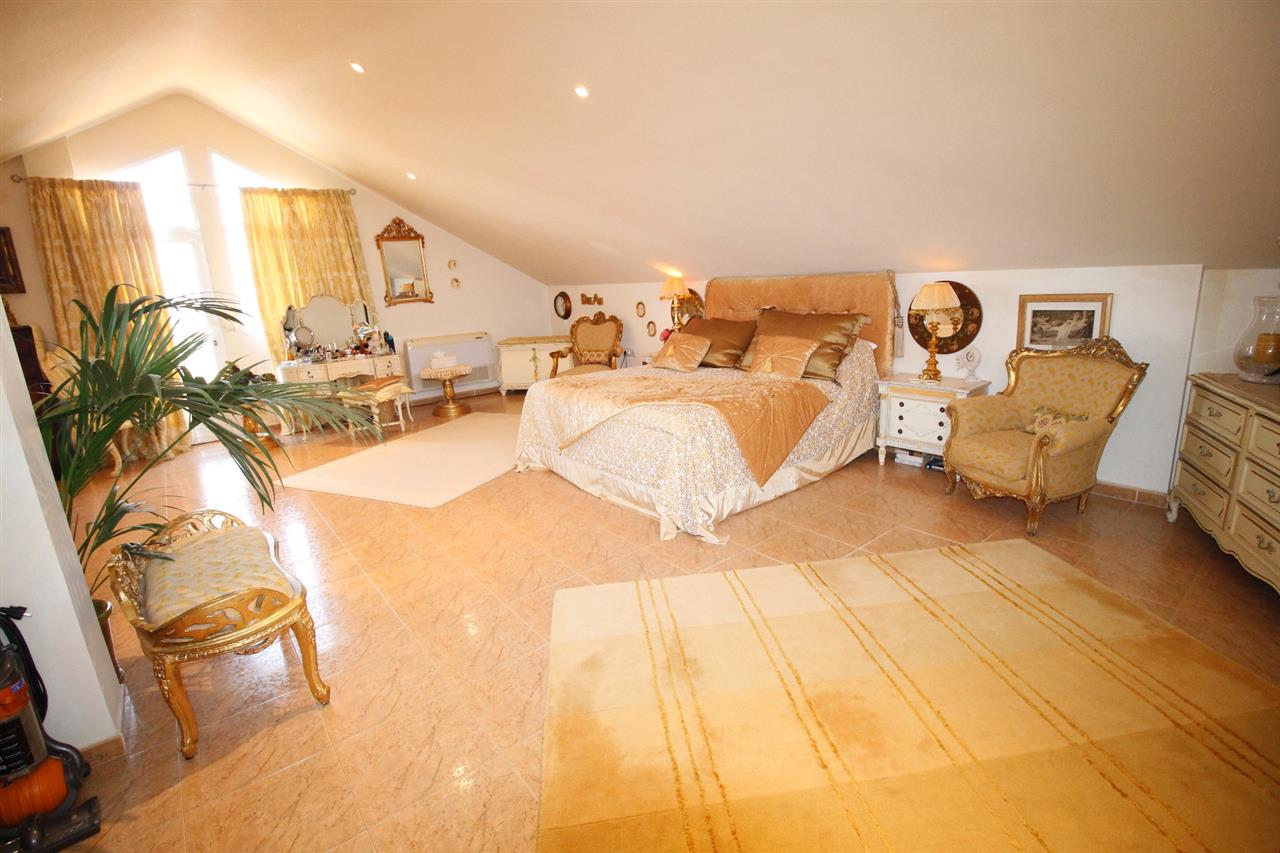 At the far end of the hallway, stairway leading up to the upper floor which is a massive open plan bedroom (could be easily converted into 2 spacious double bedrooms, if desired) taking up the entire floor (66 m2) with air-conditioning unit and a fully tiled en-suite shower room. Also doors lead out to a roof terrace which overlooks the garden, pool and provides panoramic views of the beautiful surrounding countryside.